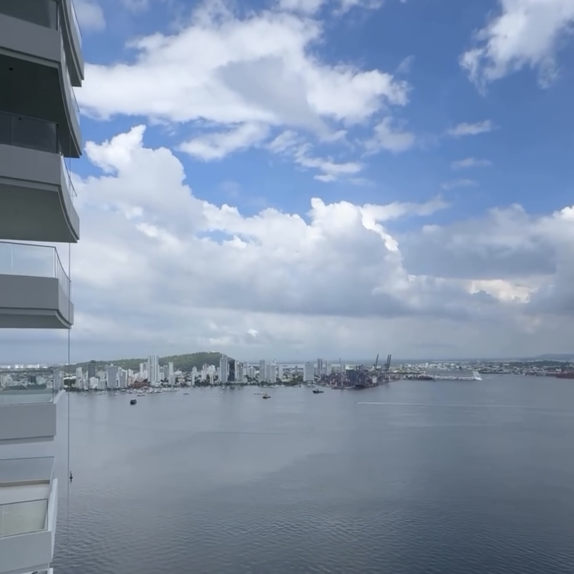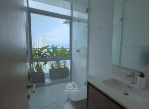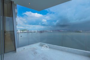 Las zonas comunes incluyen piscina con vista a la bahía, piscina de niños y de nado, gimnasio, spa, jacuzzi, salón social, parque infantil y seguridad 24/7.