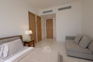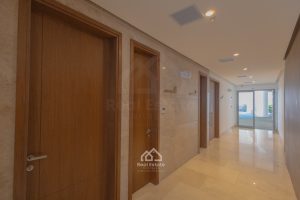 Dispone de tres habitaciones, cada una con baño privado: la principal con vestier, otra con walk-in closet y otra con amplio clóset. En total, cinco baños (cuatro y medio) con acabados de lujo.